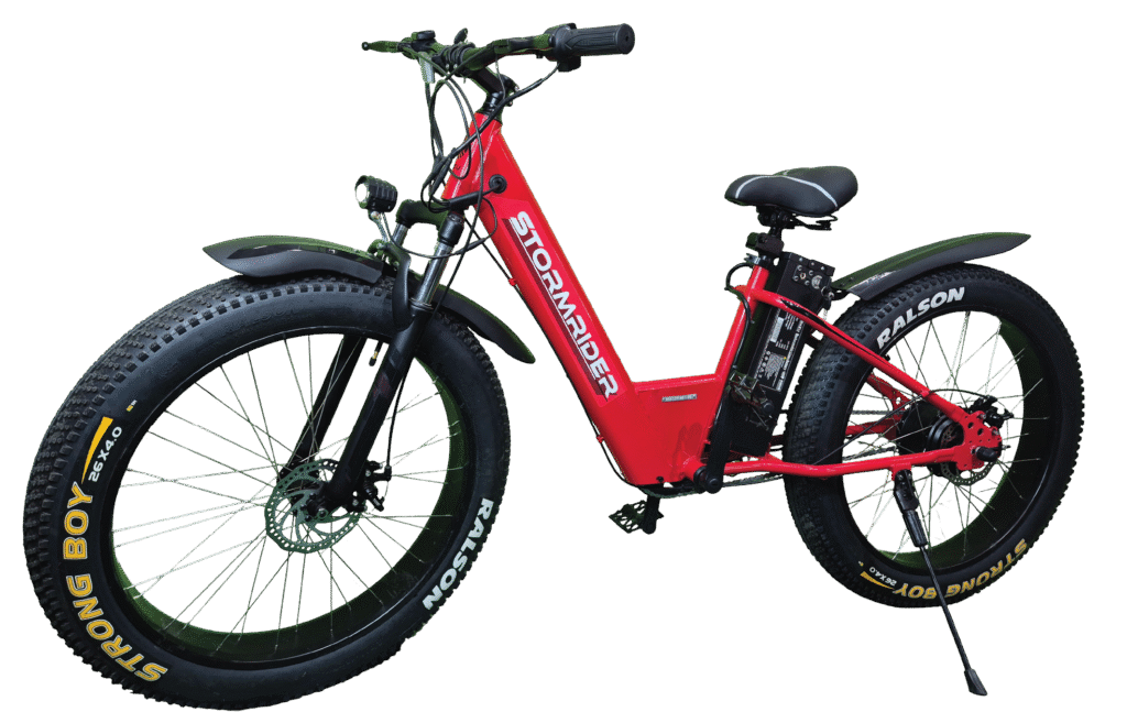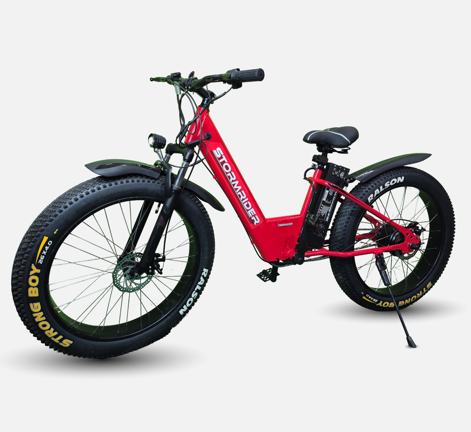 The Nexzu Stormrider eCycle is a rugged and powerful electric fat bike built for all-terrain adventures and daily commutes alike. Equipped with a high-performance 350 W waterproof powertrain kit and a long-lasting 36 V 13 Ah lithium-ion battery, it delivers superior torque and extended range in both pedal-assist and throttle modes. Its massive 26×4″ fat tyres provide exceptional grip and stability on sand, gravel, and rough roads, while dual mechanical disc brakes ensure reliable stopping power in all conditions. With a robust frame, all-weather electronics, and a sleek, aggressive design, the Stormrider is the perfect choice for riders seeking performance, durability, and style in one electric ride.